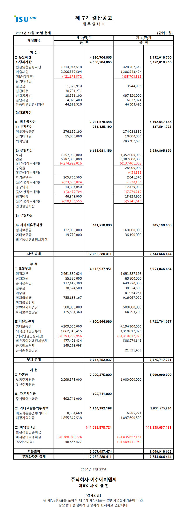 이수에이엠씨 정관 제4조 공고방법에 의거한 "제 7기 결산공고"
